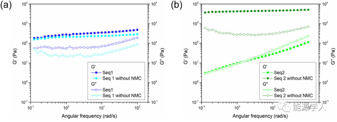 1)在順序1中的第二次混合過程中,CB納米顆粒分首先和PVDF纖維結(jié)合形成穩(wěn)定的凝膠,再與加入的NMC顆粒發(fā)生強相互作用,凝膠結(jié)構(gòu)得以保留。