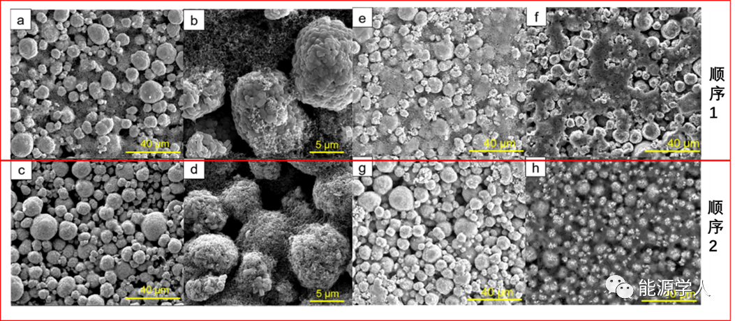 圖3. 電極的SEM圖像:壓延前(a-d),壓延后(e-h)。(a),(b)和(e)是使用順序1制作的電極的上表面。(c),(d)和(g)是使用順序2制作的電極的上表面。(f)和(h)分別是用順序1和順序2制成的電極的底表面(KOH溶液中除去鋁集流體)
