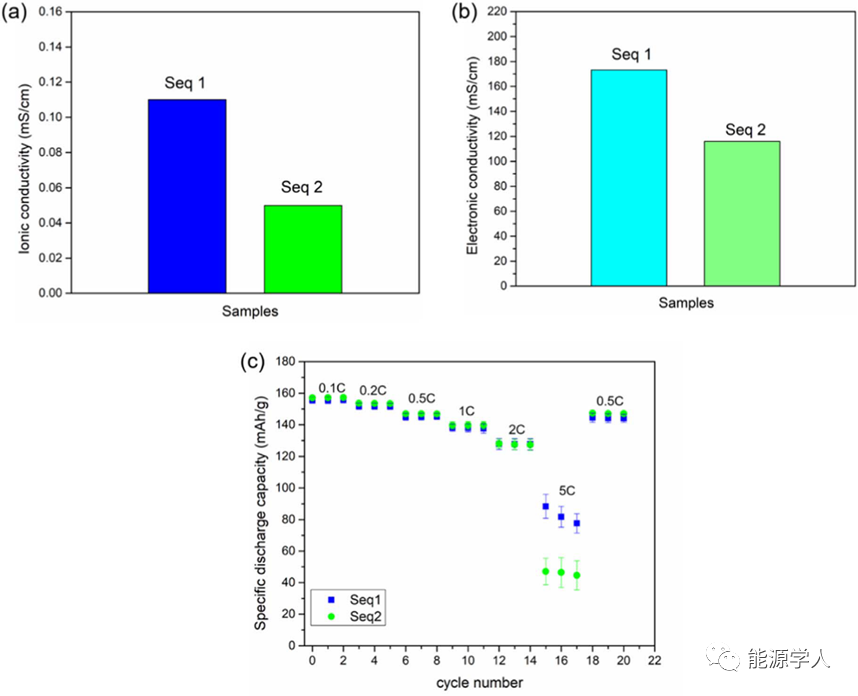 圖6. 兩種順序制備電極的(a)離子電導率,(b)電子電導率和(c)倍率性能