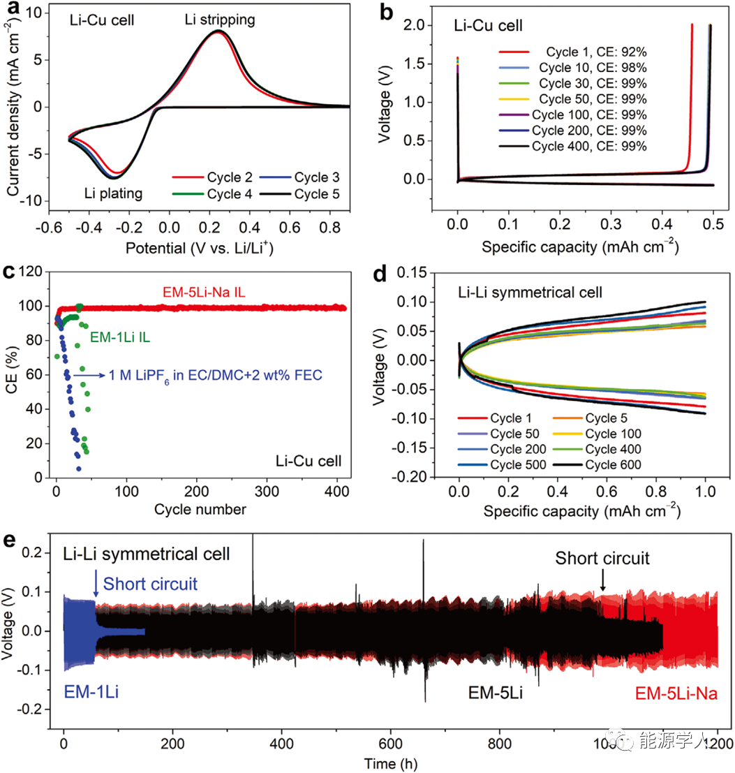 采用EM-5Li-Na IL電解液組裝Li-Cu電池,由其循環(huán)伏安曲線可知(圖2a),Li的沉積/溶解顯示出高可逆性。對該電池進行恒流充放電測試(電流密度0.5 mA cm-2,Li金屬沉積容量0.5 mAh cm-2)。結果表明,在SEI形成的前10個循環(huán)中,CE從92%增至98%,在之后的400多個循環(huán)中基本穩(wěn)定在≈99%(圖2b,c),遠遠超過其他Li基IL電解質。組裝Li/Li對稱電池在恒定電流密度1 mA cm-2和恒定容量1 mAh cm-2下進行充放電測試,其在EM-5Li-Na IL電解質中循環(huán)1200 h時,極化略有增加(圖2d,e),但小于其在 EM-1Li和不含NaTFSI添加劑的EM-5Li IL電解質中的極化(圖2e)。作者認為這與不同電解質中Li的沉積形態(tài)有關。例如,在有機和EM-1Li IL電解液中可以觀察到銅箔上的樹枝狀Li鍍層,導致形成“死鋰”,最終導致短路和較差的循環(huán)穩(wěn)定性。相反,在EM-5Li-Na IL電解質中觀察到密集堆積的Li顆粒,沒有明顯的樹突形態(tài)。