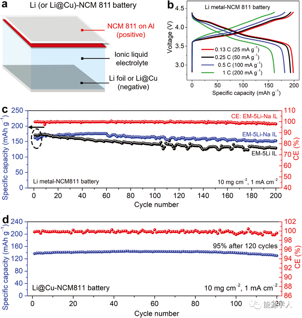 圖5 采用EM-5Li-Na-IL電解液的NCM811基鋰金屬電池。a) NCM811基鋰金屬電池結構示意圖,負極為Li金屬或Li@Cu。b) NCM811基鋰金屬電池不同倍率下(0.25-1 C,25-200 mA g-1)的恒流充放電曲線。c) 分別使用EM-5Li和EM-5Li-NaIL電解液的Li-NCM811電池在0.5 C下的循環(huán)穩(wěn)定性。(b-c)中的比容量均基于NCM811的質量。d) 使用EM-5Li-Na IL電解液的Li@Cu-NCM811電池在0.5 C下的的循環(huán)穩(wěn)定性。所沉積Li金屬的容量約1.8倍過量。(d)中比容量基于正、負極總質量。(a-d)中NCM811的載量為≈10 mgcm?2。