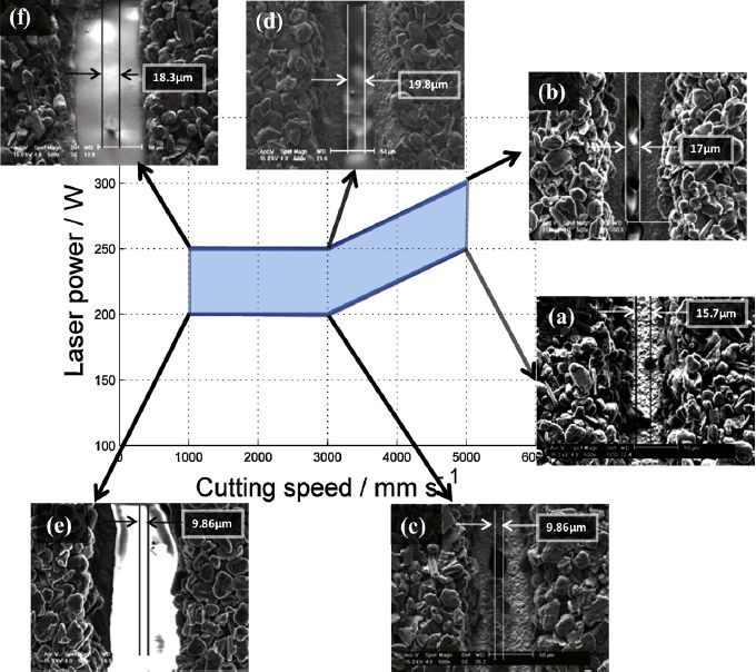 其中,激光能量和切割移動速度是兩個主要的工藝參數(shù),對切割質(zhì)量影響巨大。圖5是不同的激光切割工藝條件下單面涂層負極極片的切邊形貌,圖6是不同的激光切割工藝條件下單面涂層正極極片的切邊形貌。當激光功率太低或者移動速度太快時,極片不能完全切開,而當功率太高或移動速度太低時,激光對材料作用區(qū)域變大,切縫尺寸更大。