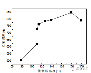 焊接工藝參數(shù)不同,導致焊機供給被焊工件的焊接總能量變化,必然引起焊接過程中的摩擦作用不同,致使焊接過程中產(chǎn)生的熱量變化,那么焊接過程中工件的溫度也將隨之變化,焊頭-工件接觸區(qū)溫度可以有效反映接頭強度,可以通過測量焊接過程中工件的溫度預測接頭質量。但接觸區(qū)溫度并不是越高越好,對于每種被焊材料匹配,都有一個臨界溫度值,工件溫度小于臨界溫度時,溫度越高則接頭強度越高;工件溫度大于臨界溫度時,接頭強度則會減弱。