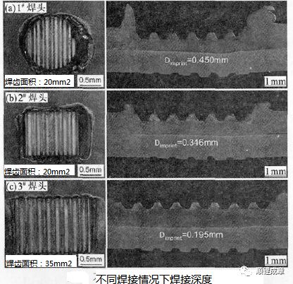 焊頭是超聲波金屬焊接的關鍵組成部分,焊接過程中,焊頭在壓力作用下要抓緊被焊工件,這樣,超聲波焊機產(chǎn)生的機械振動才能傳遞給被焊工件界面以形成固相連接。焊頭面積不同,會導致焊接過程中焊接壓力的分布不同,即連接界面的具有不同的應力,使焊接過程中摩擦力不同,從而使焊接過程中摩擦產(chǎn)熱量不同,導致焊接過程中工件溫度不同,最終影響接頭質量。而焊頭花紋齒深則決定焊頭花紋嵌入工件表面的難易程度,也直接影響工件表面壓痕深度,間接影響焊接過程中工件溫度,對接頭質量造成影響。因此,焊頭形貌及尺寸對接頭質量有非常關鍵的作用。