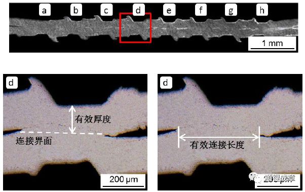 工件與工件連接界面僅在壓痕槽下方存在連接,接頭連接界面的所有槽下方的連接長度求和得到接頭連接長度的總和,稱之為有效連接長度,也是塑性變形量的一個衡量指標。